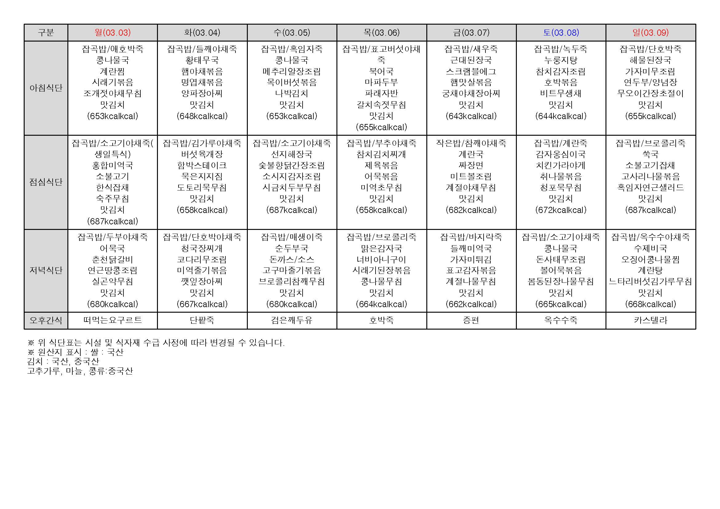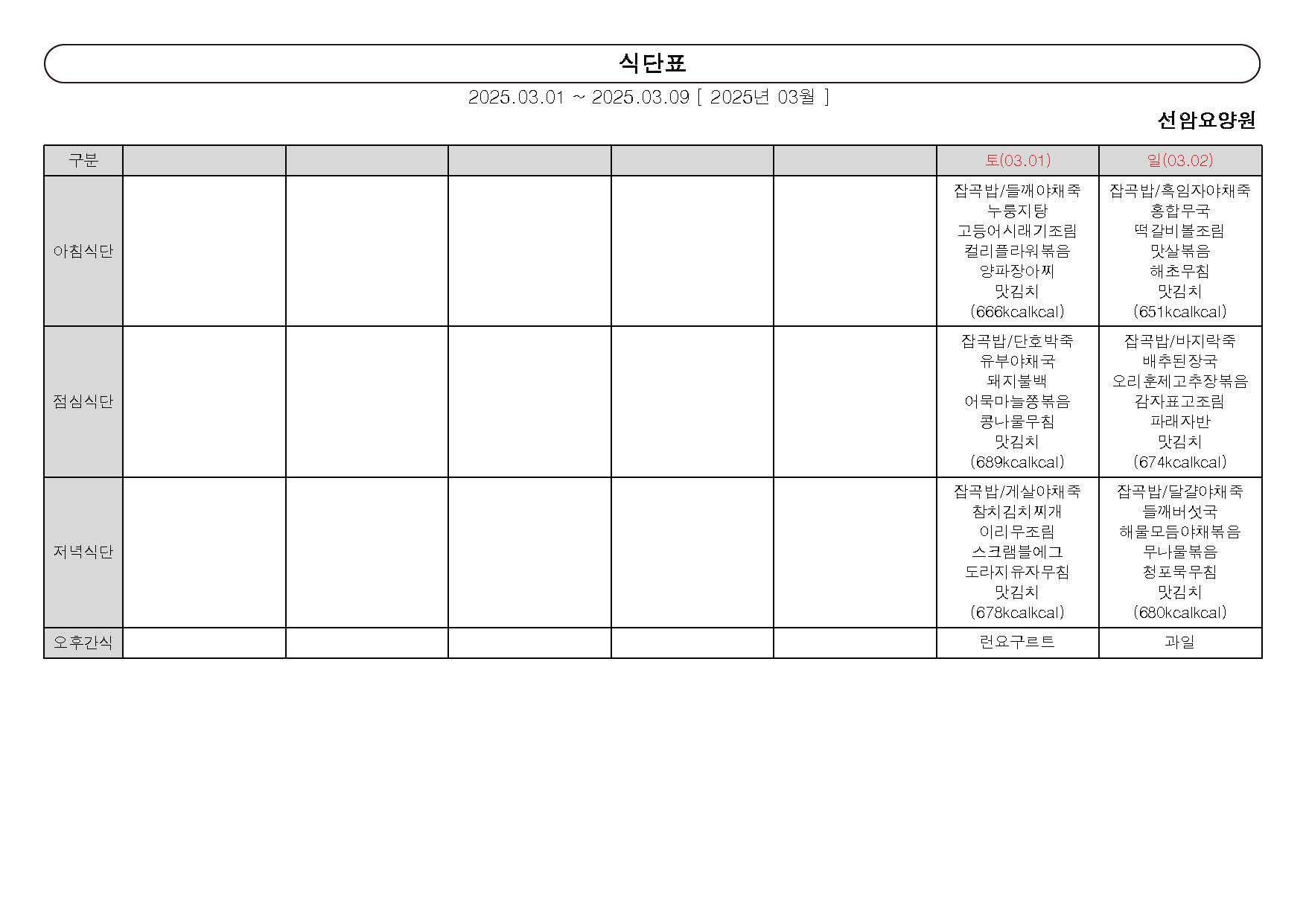 2025년 3월 첫째 주 식단표 (01일 ~ 09일)