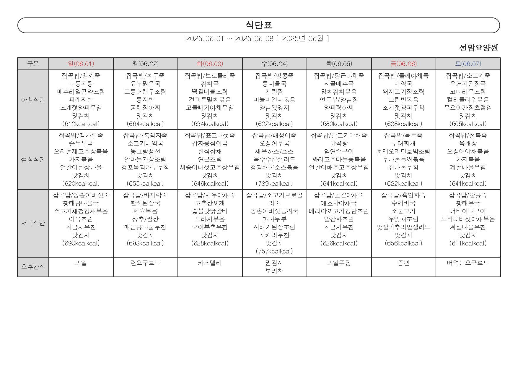2025년 6월 첫째 주 식단표 (01일 ~ 08일)