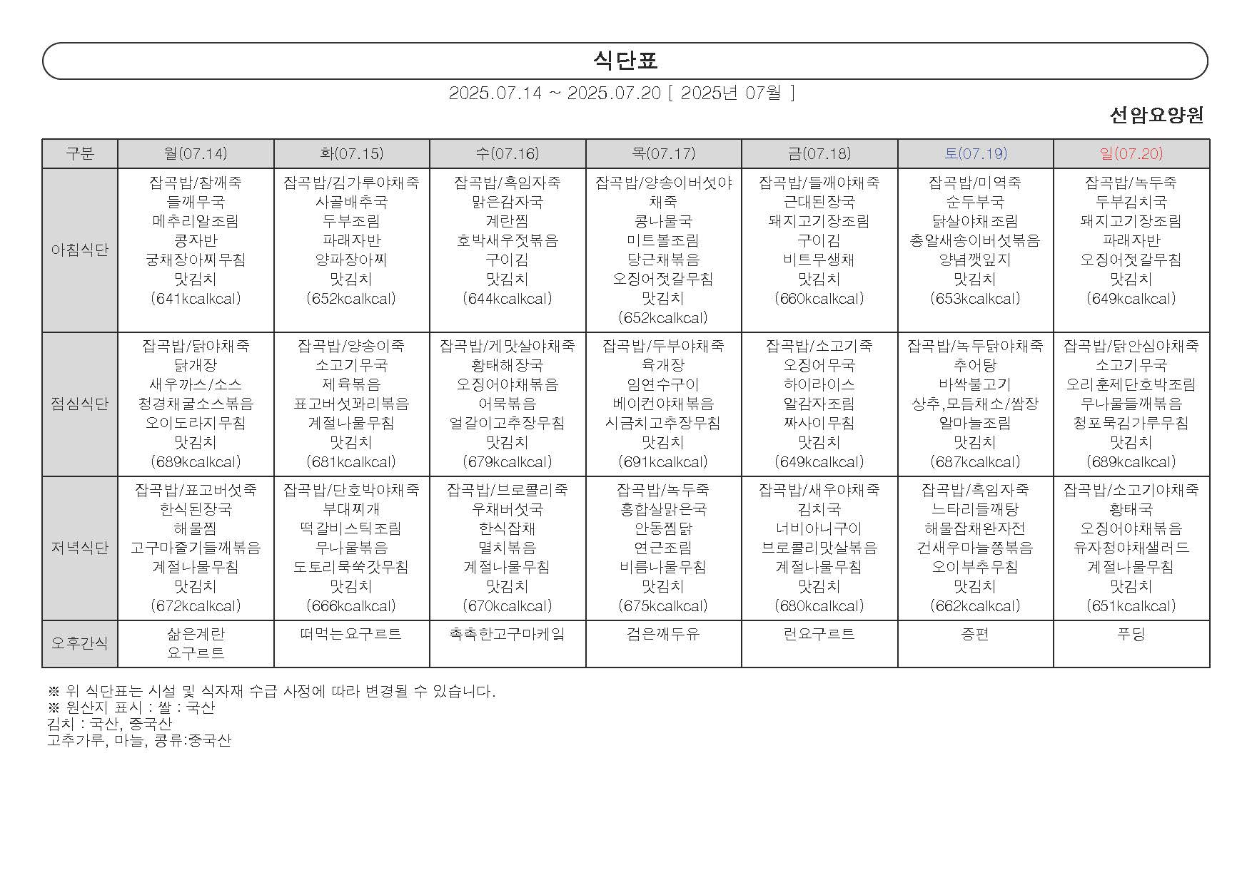 2025년 7월 셋째 주 식단표 (14일 ~ 20일)