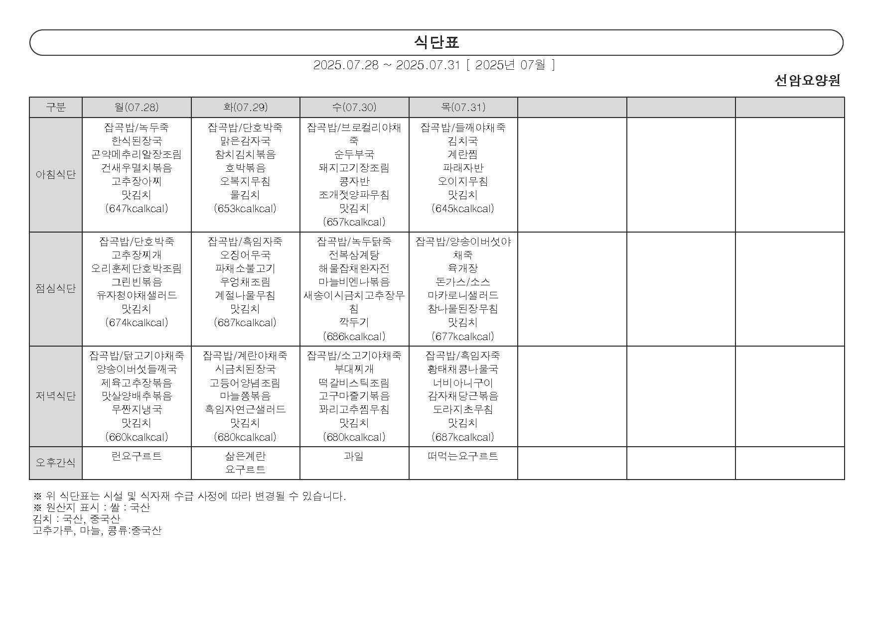 2025년 7월 다섯째 주 식단표 (28일 ~ 31일)