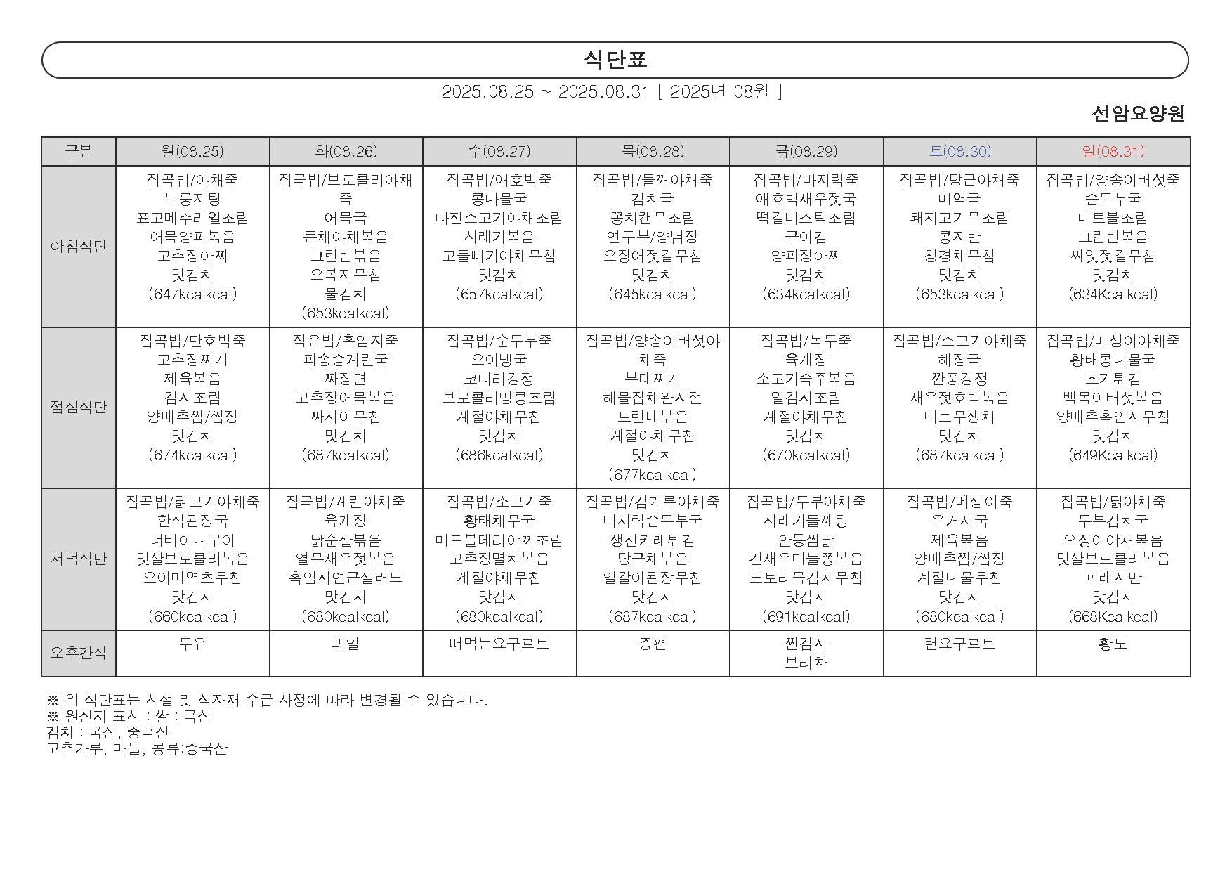 2025년 8월 넷째 주 식단표 (25일 ~ 31일)