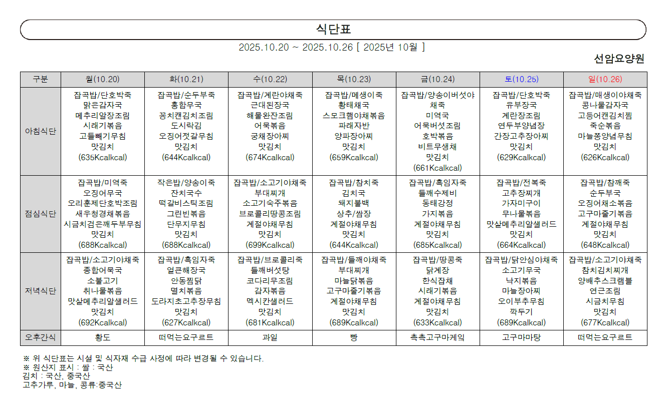 2025년 10월 넷째 주 식단표 (20일~26일)