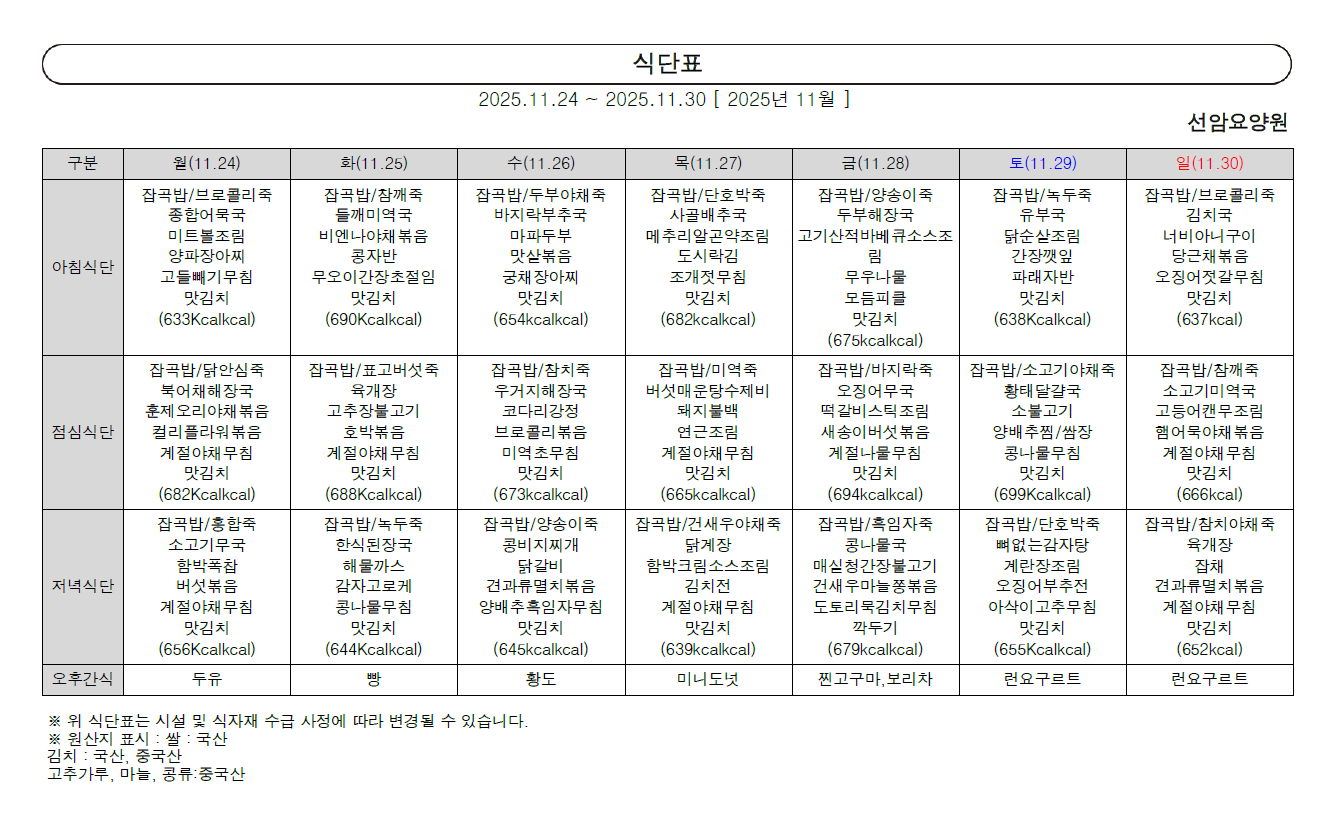 2025년 11월 넷째 주 식단표 (24일 ~ 30일)