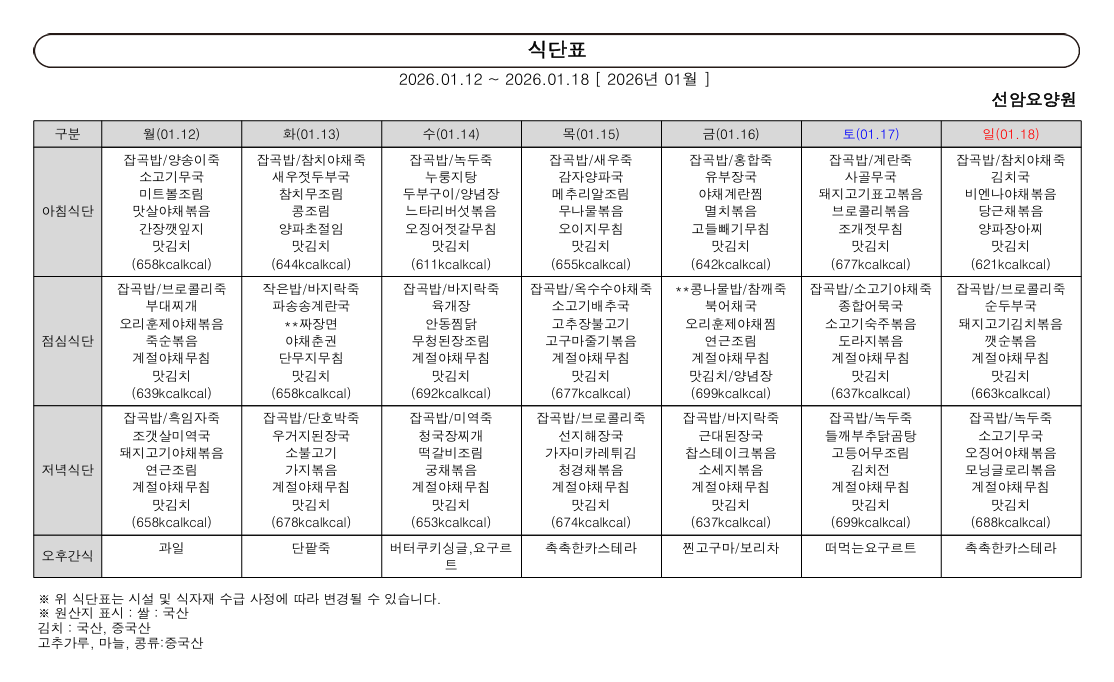 2026년 1월 셋째 주 식단표 (12일~18일)