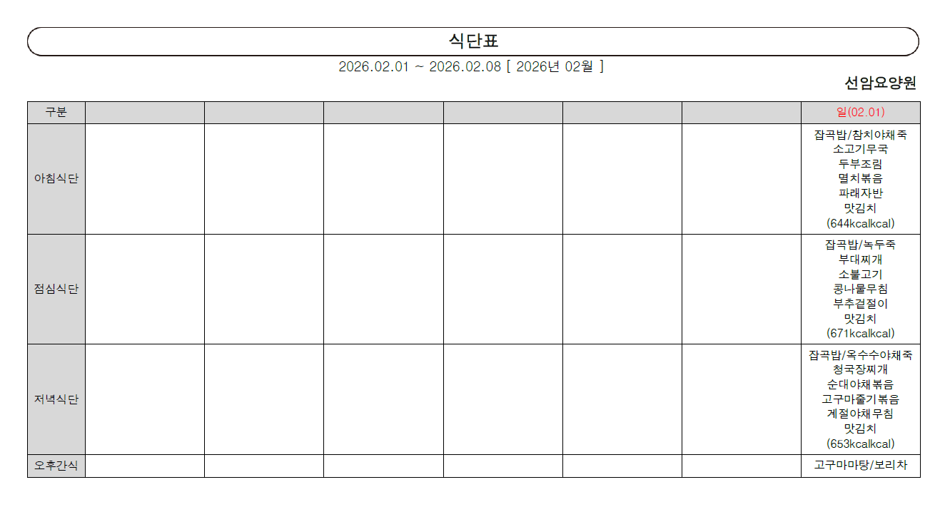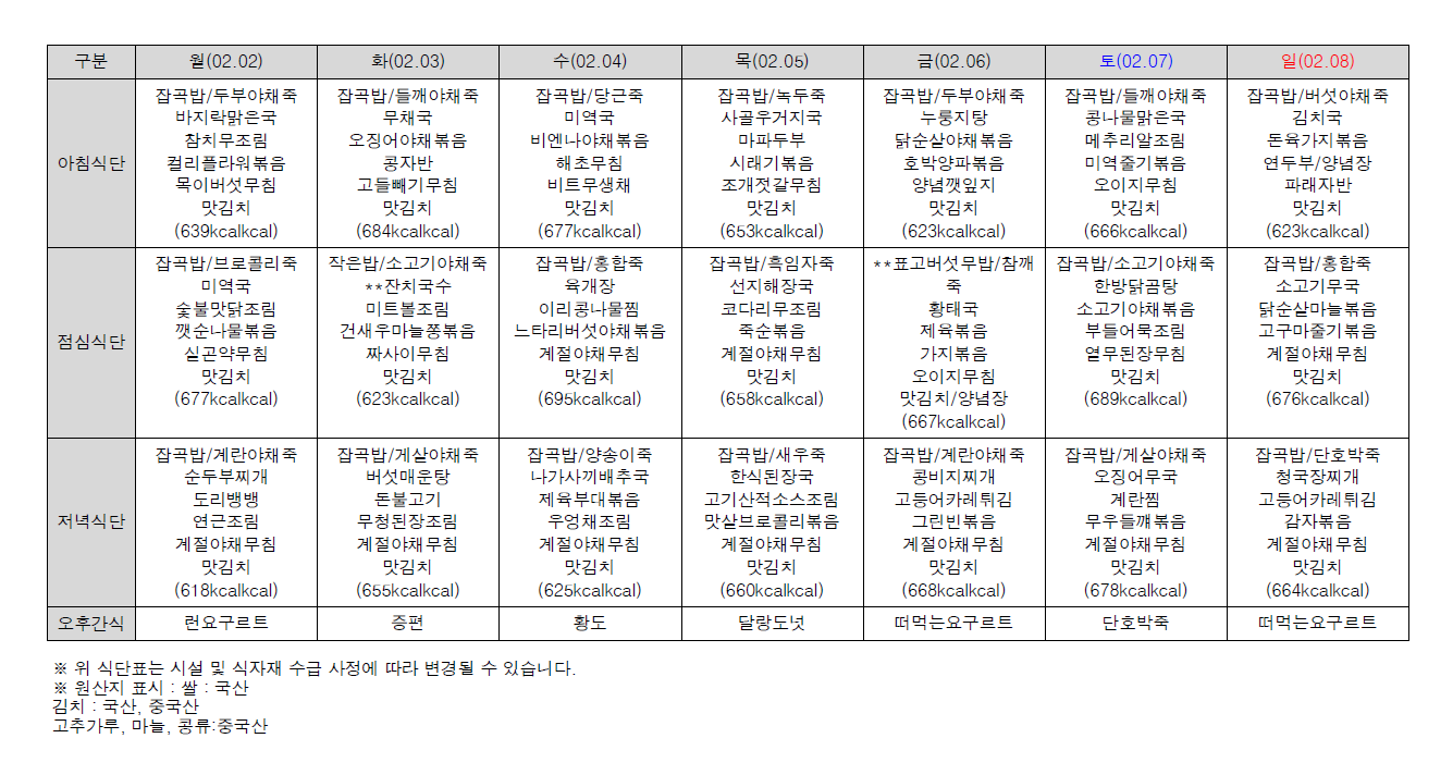 2026년 2월 첫째 주 식단표 (1일~8일)
