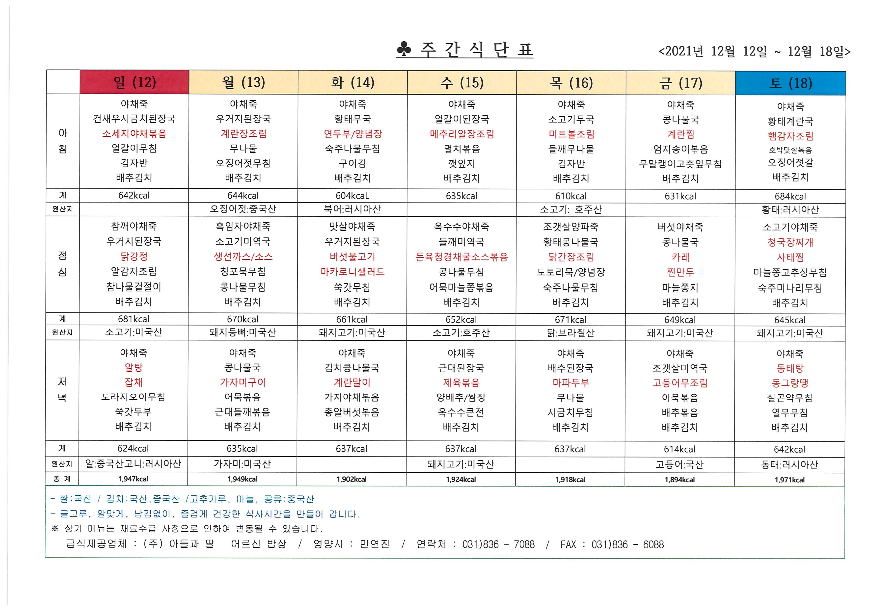 2021년 12월 셋째 주 식단표 (12일 ~ 18일)