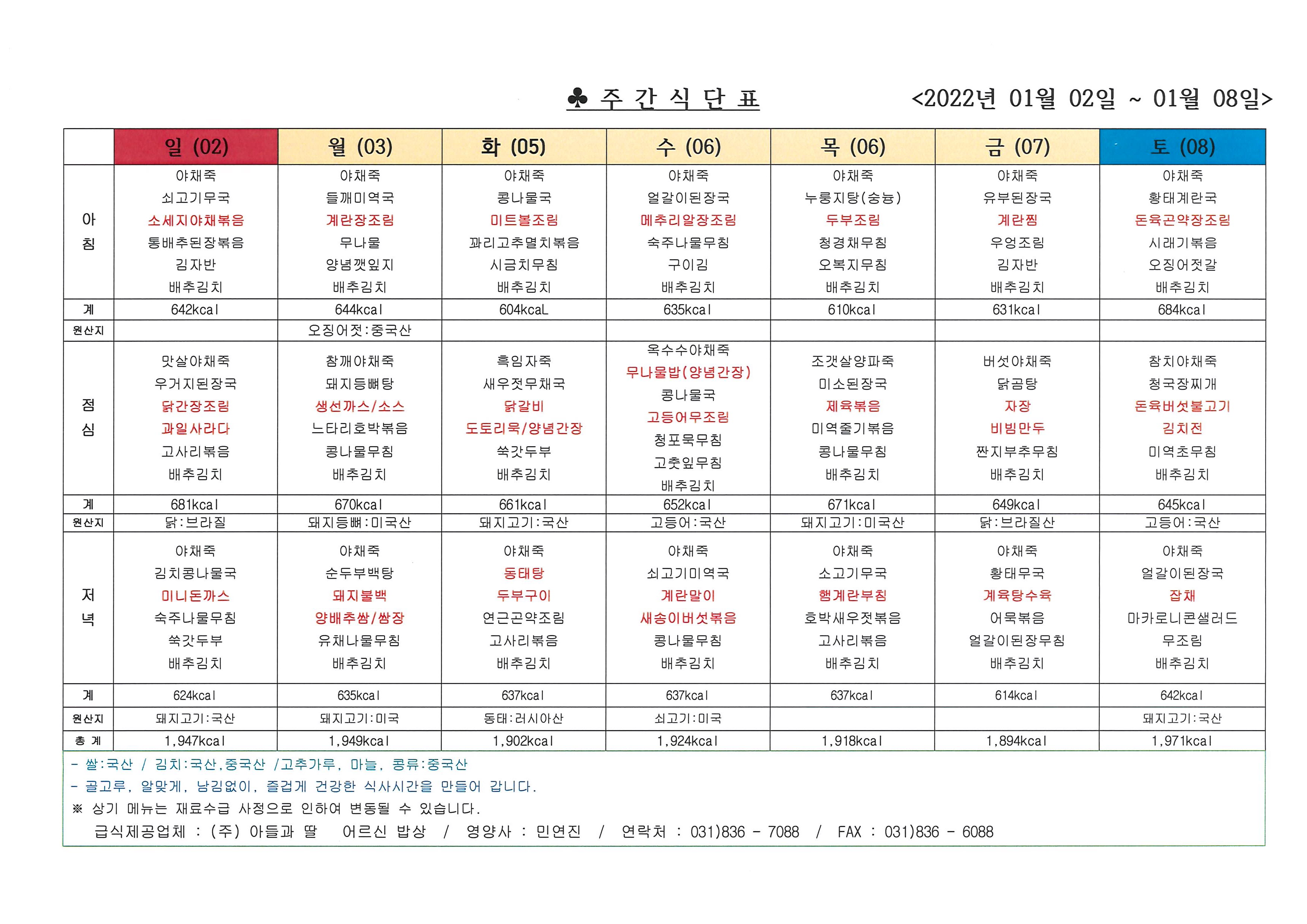 2022년 1월 첫째 주 식단표 (02일 ~ 08일)