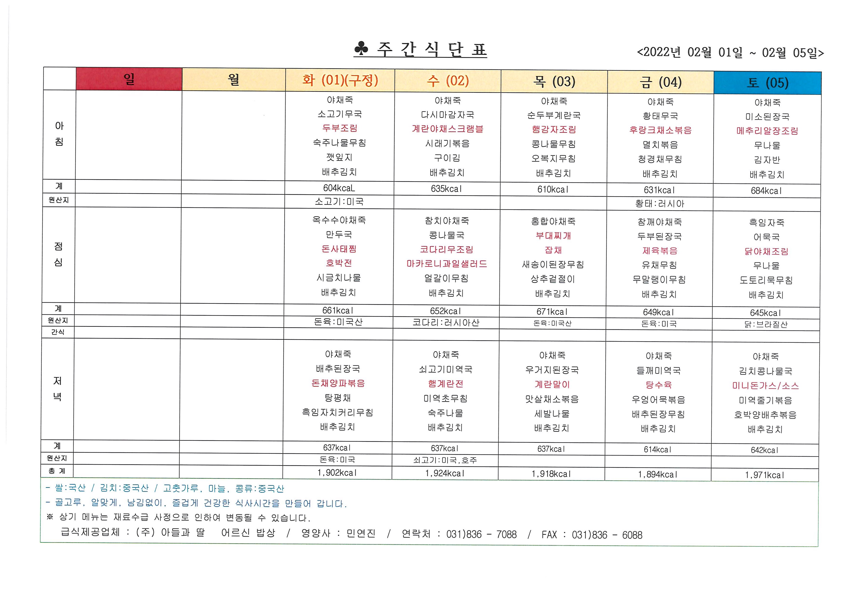 2022년 2월 첫째 주 식단표 (01일 ~ 05일)