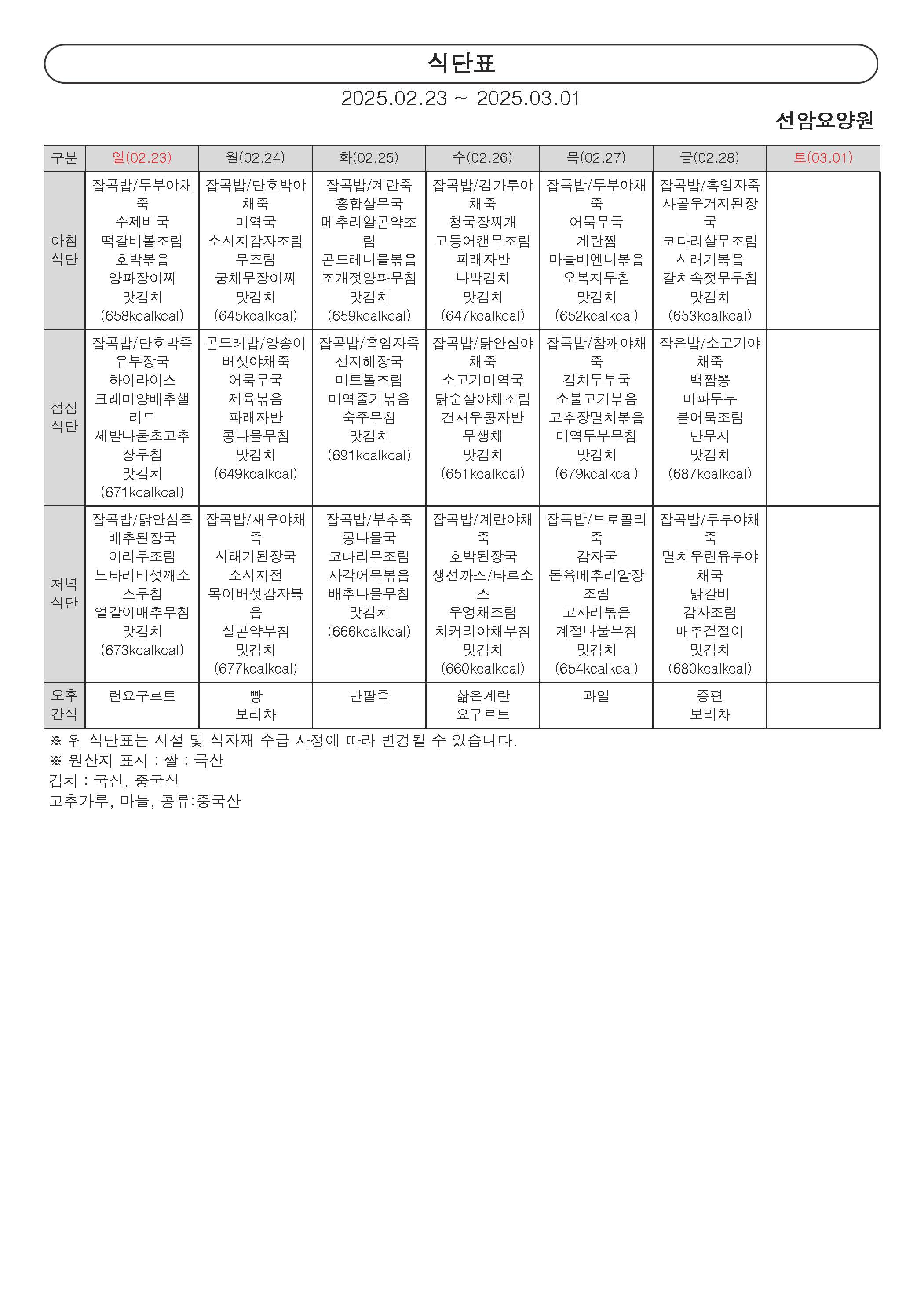 2025년 2월 넷째 주 식단표 (23일 ~ 28일)