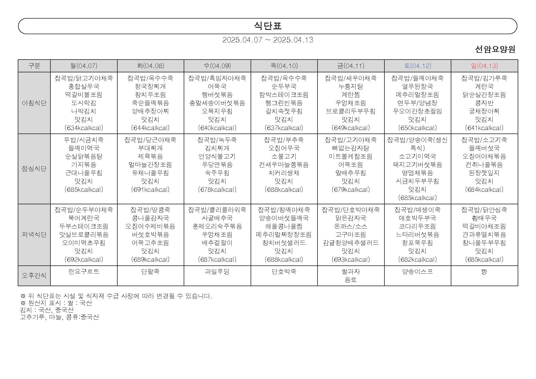 2025년 4월 둘째 주 식단표 (07일 ~ 13일)