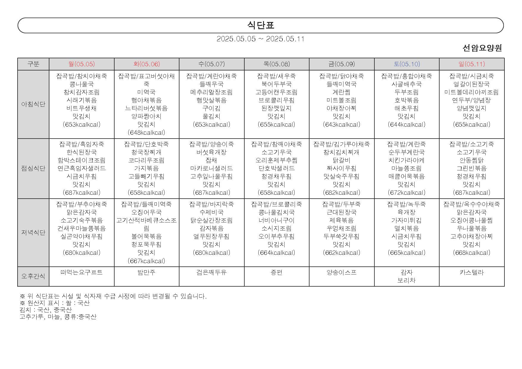 2025년 5월 첫째 주 식단표 (05일 ~ 11일)