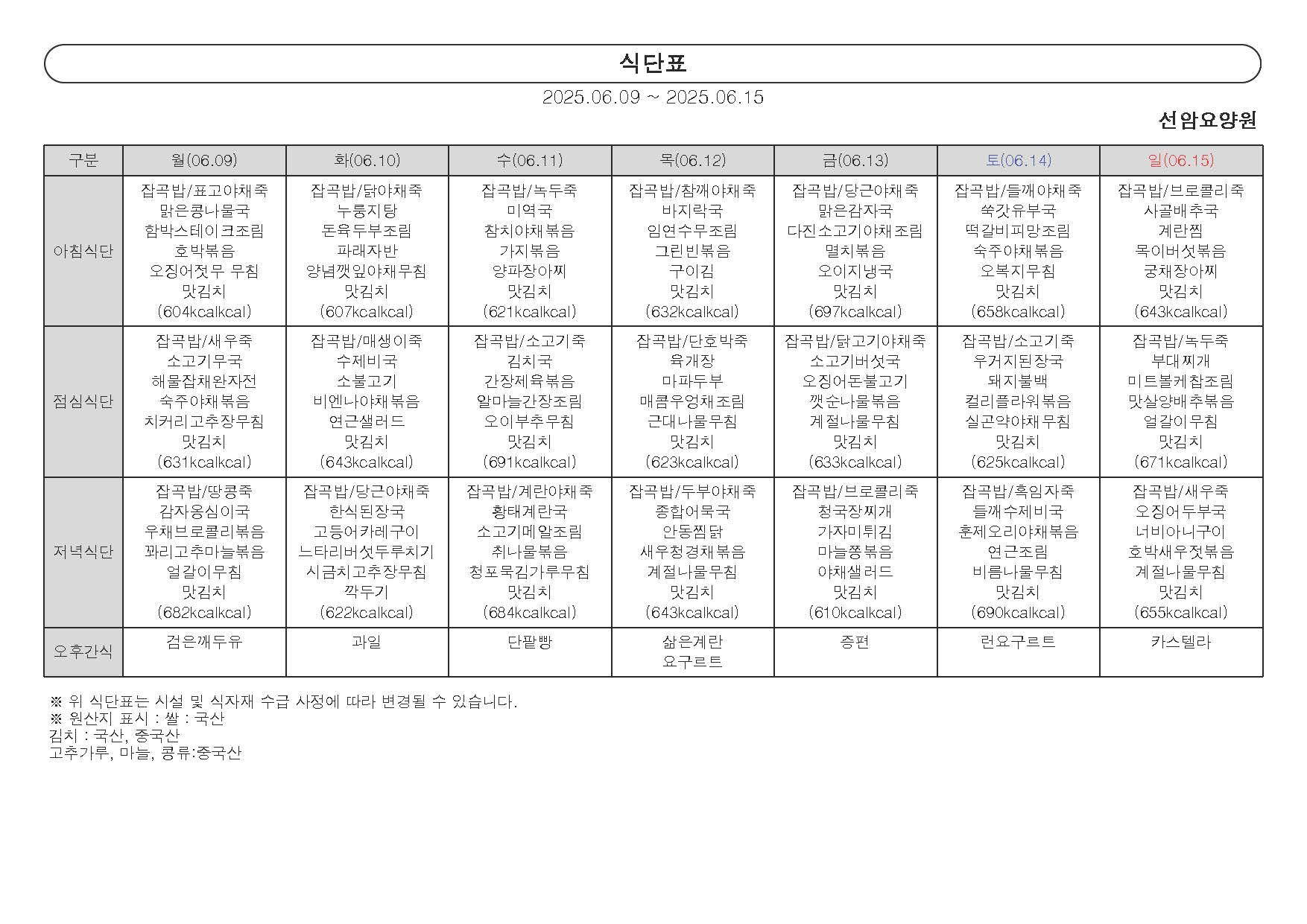 2025년 6월 둘째 주 식단표 (09일 ~ 15일)
