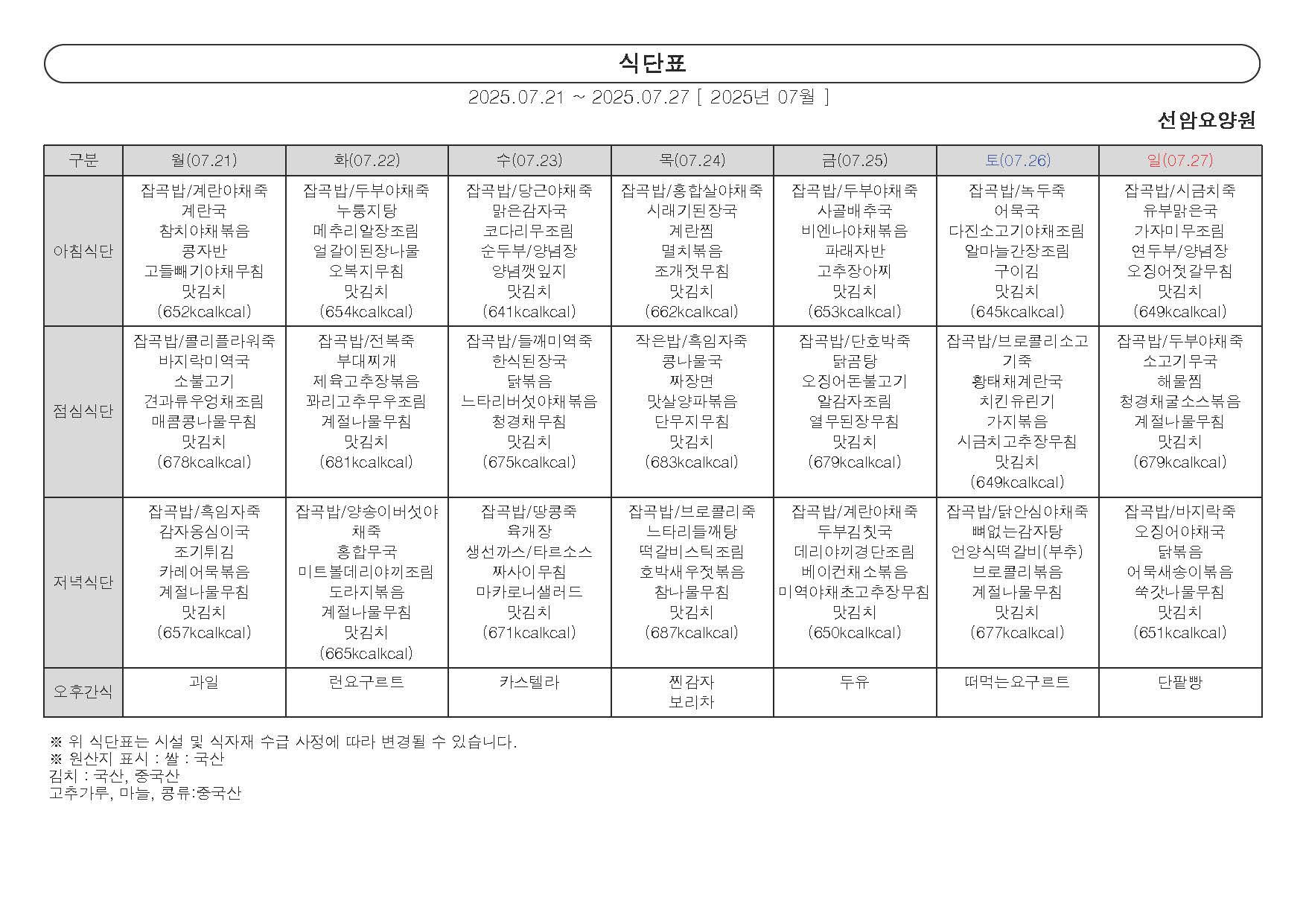 2025년 7월 넷째 주 식단표 (21일 ~ 27일)