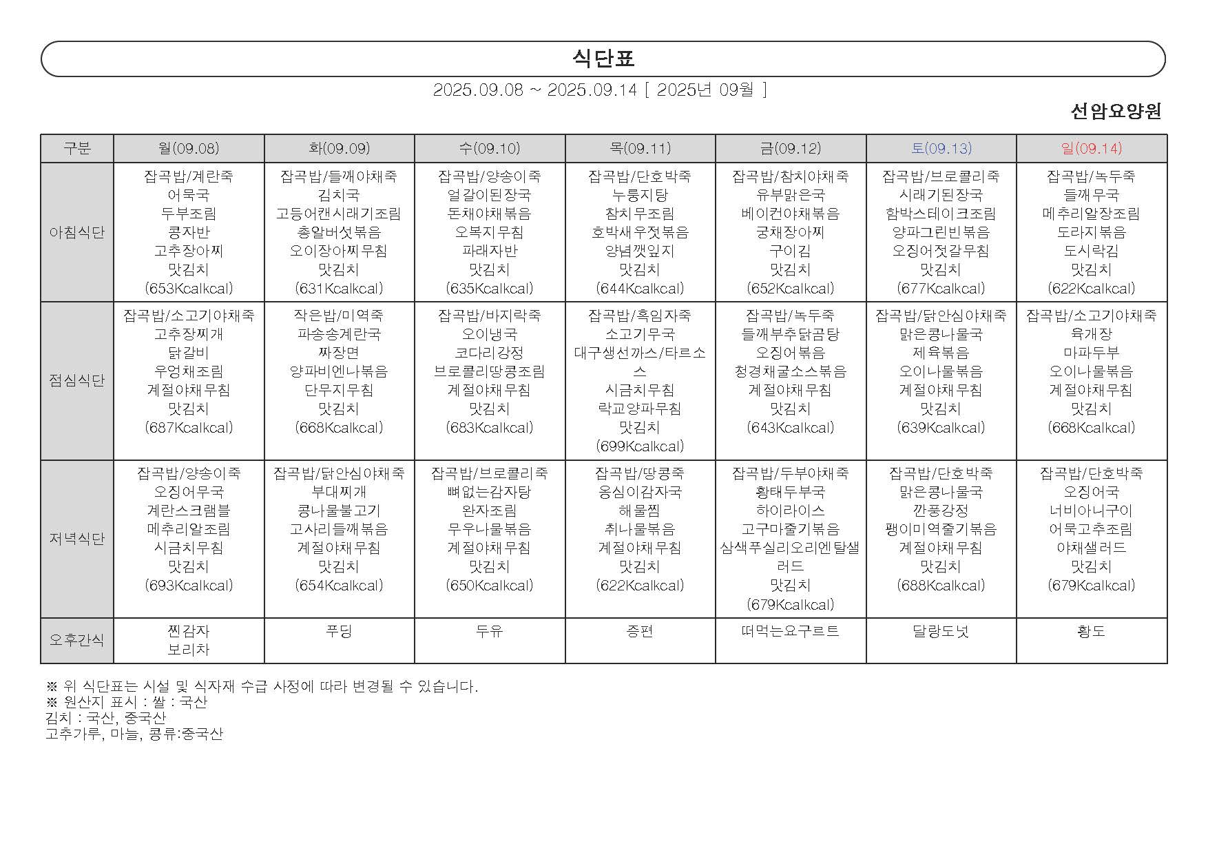 2025년 9월 둘째 주 식단표 (08일 ~ 14일)