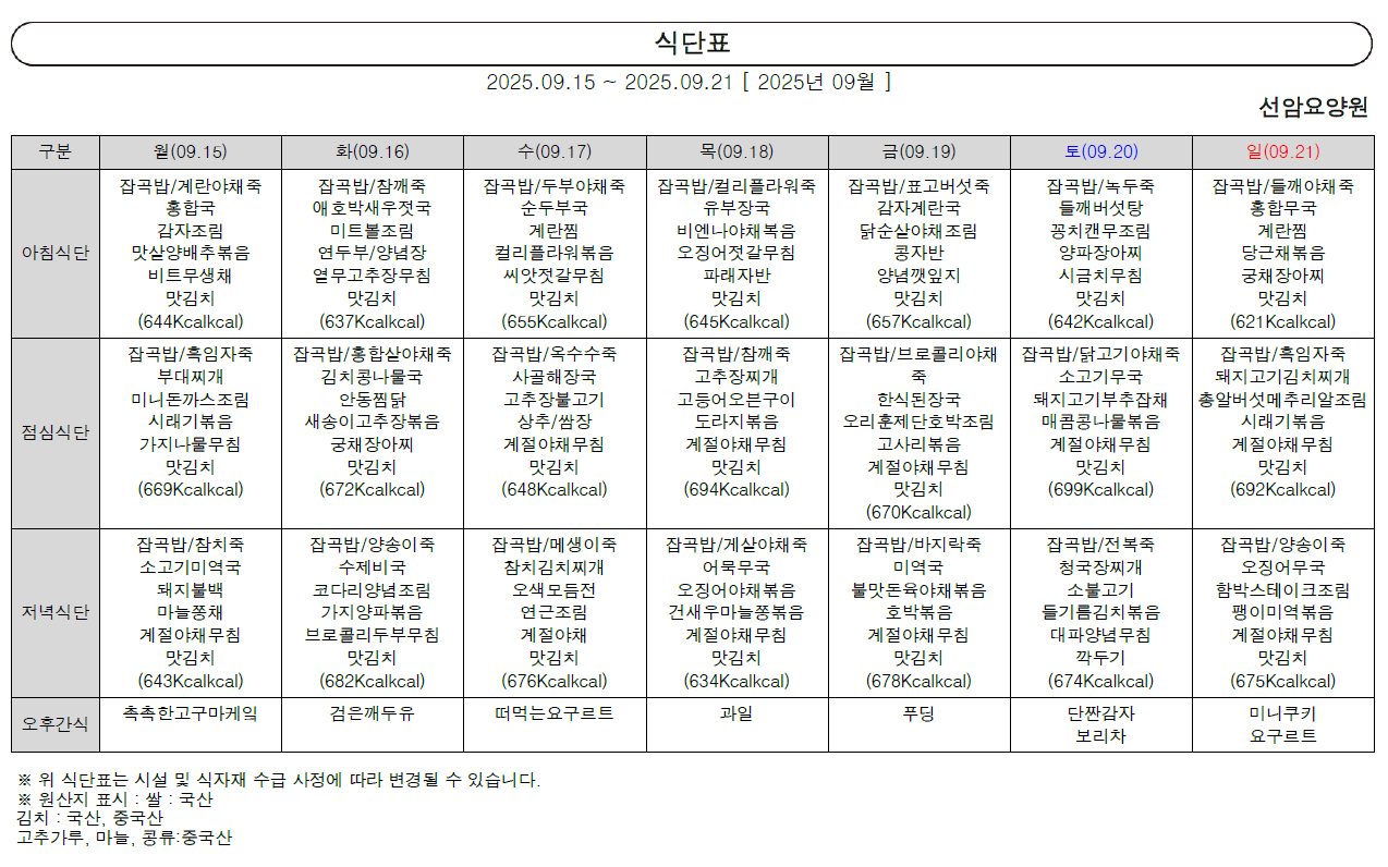 2025년 9월 셋째 주 식단표 (15일~21일)