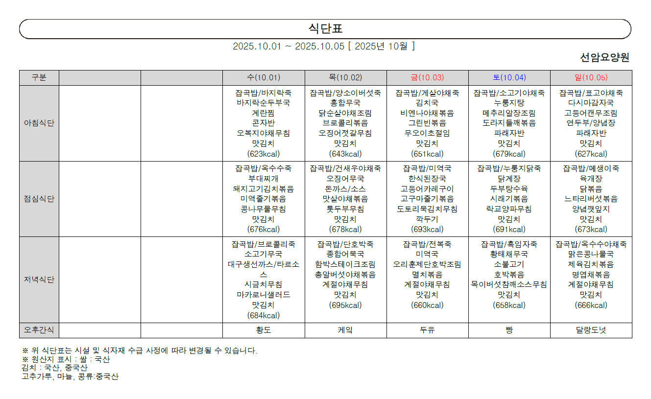 2025년 10월 첫째 주 식단표 (01일~05일)