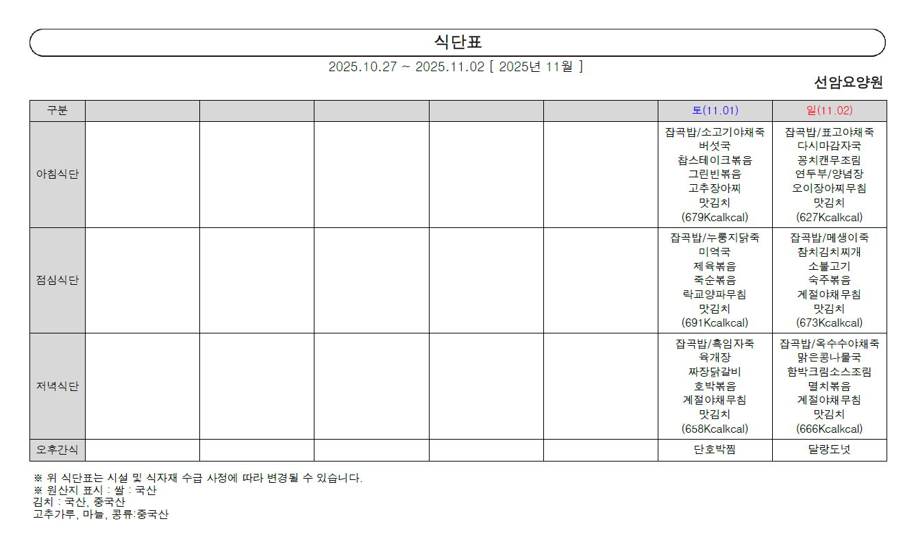 2025년 10월 다섯째 주 식단표 (27일~11월 02일)