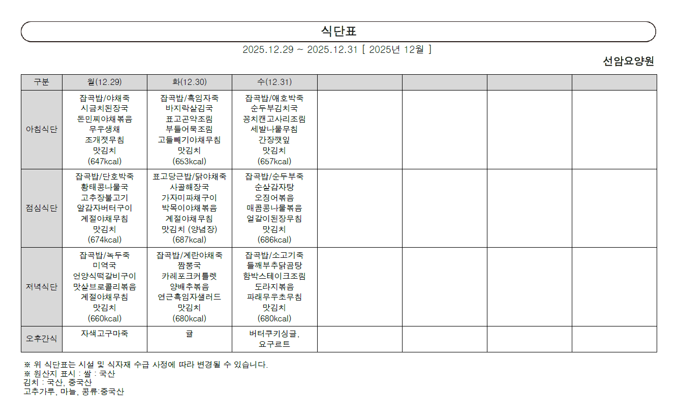 2025년 12월 다섯째 주 식단표 (29일~31일)