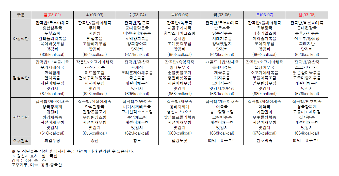 2026년 3월 첫째 주 식단표 (1일~8일)