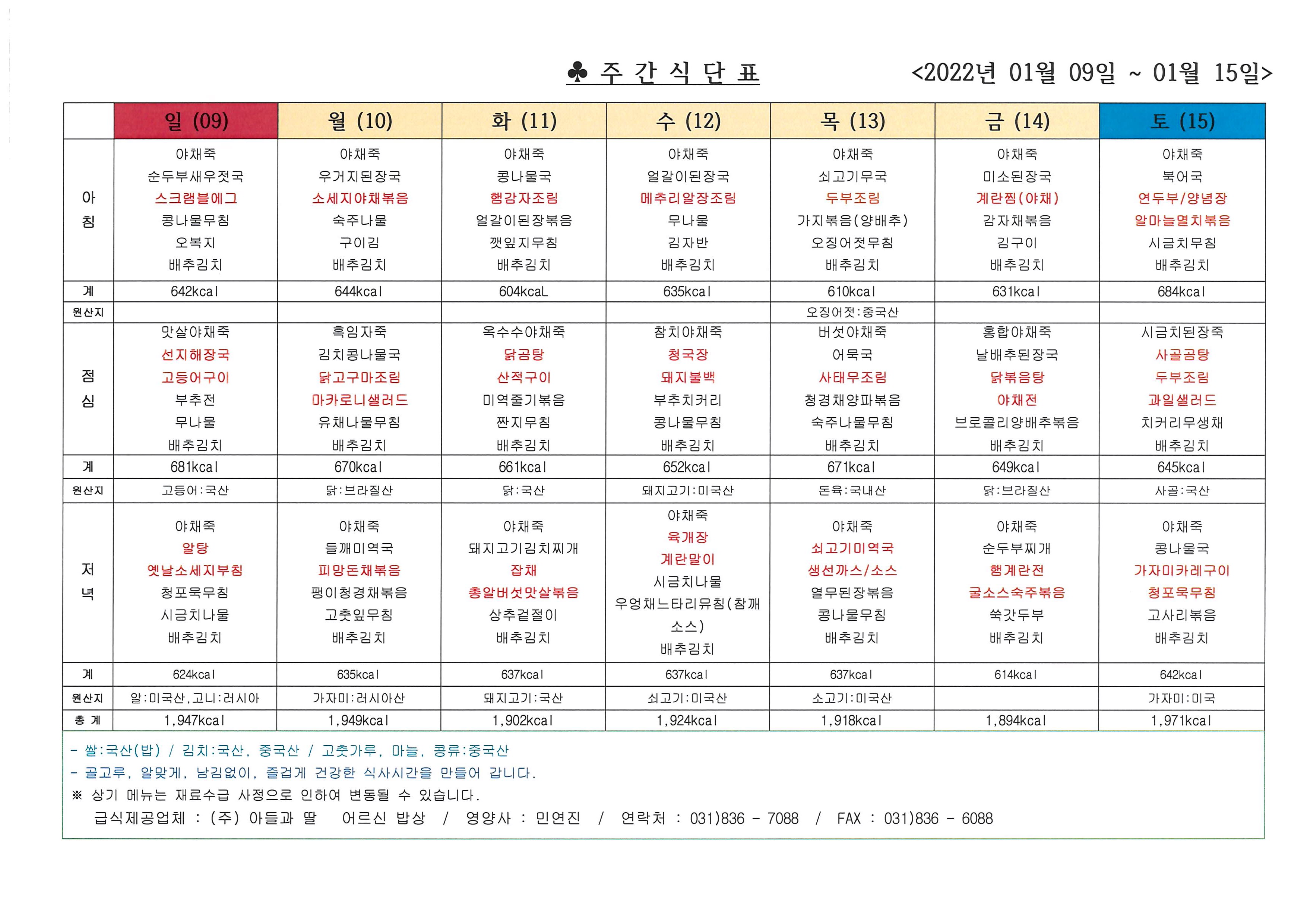 2022년 1월 둘째 주 식단표 (09일 ~ 15일)